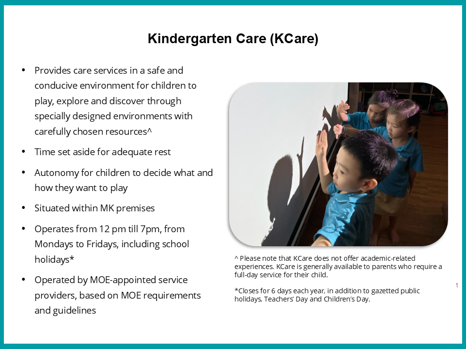 Kindergarten Care (KCare) is available in all MOE Kindergartens (MK) located within primary schools. If you register, your child can be in KCare after their MK session, providing the convenience of a full-day service.